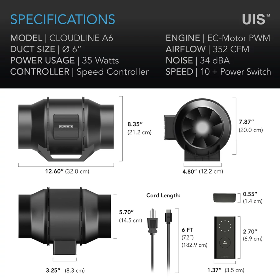 AC Infinity Cloudline Lite A6 ventilátort sebességszabályzóval úgy tervezték, hogy csendesen szellőztesse a termesztősátrakat, elszívja a szagokat, átadja a fűtést/hűtést a szobáknak és hűtse az AV-szekrényeket.