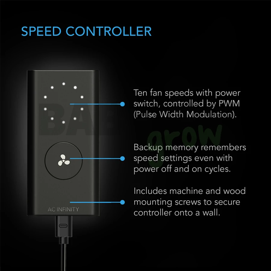 A sebességszabályozó lehetővé teszi, hogy a csatornaventilátor sebességét tíz sebességfokozat között állítsa be a különböző környezetekben optimális zaj- és légáramlási szintekhez. A precíz légáramlás-szabályozást a soros ventilátor élvonalbeli EC-motorja támogatja, amelyet PWM (impulzusszélesség-moduláció) segítségével pontosan szabályoz. Ez lehetővé teszi, hogy rendkívül alacsony fordulatszámon is zökkenőmentesen, motorzaj generálása nélkül működjön. Tartalékmemóriával is rendelkezik, amely megőrzi az utolsó fordulatszám-beállítást, ha a vezérlő áramellátása megszakad.