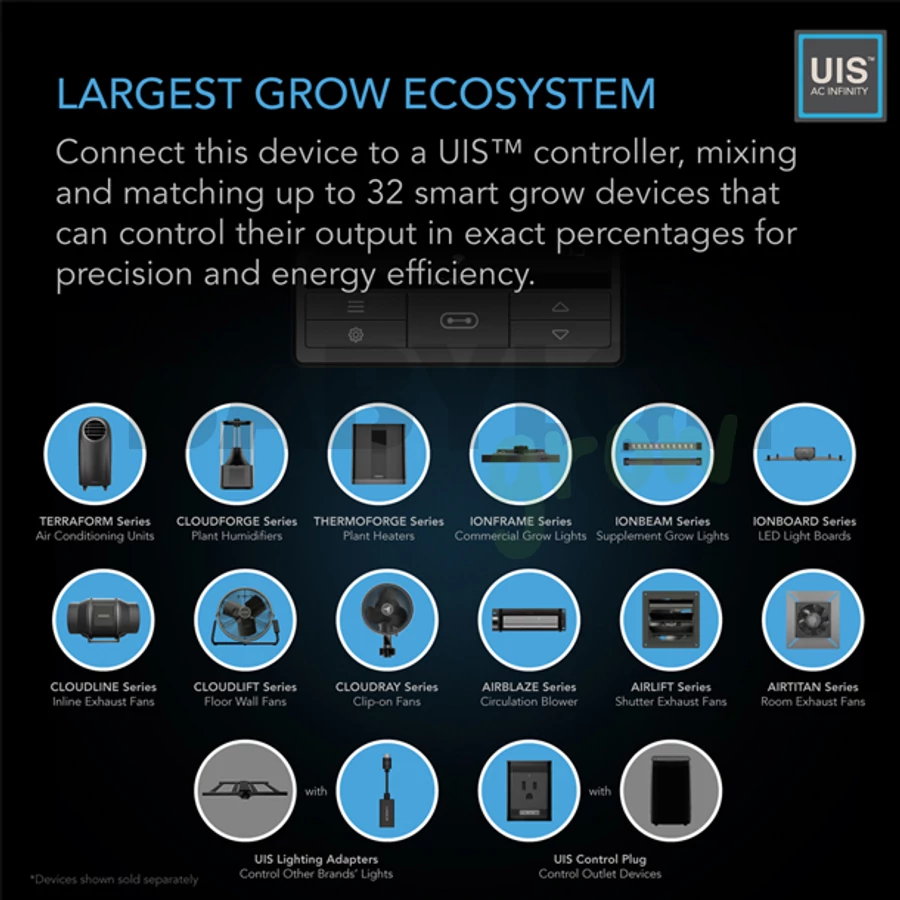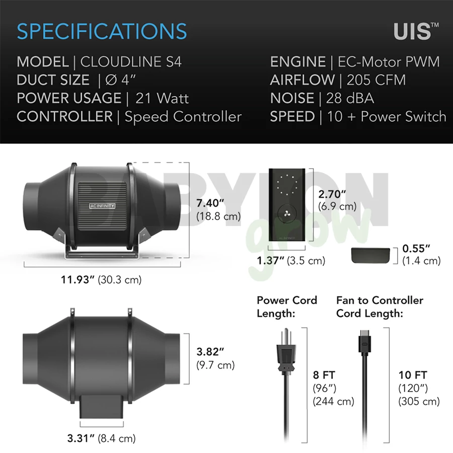 Az AC Infinity Cloudline Pro S4 ventilátor egy intelligens inline csatornaventilátor, amelyet úgy terveztek, hogy csendesen szellőztesse a hidrokultúrás termesztőhelyiségeket, növelje a szobák fűtését/hűtését és keringesse a friss levegőt. Az inline vegyes áramlású kialakítású csatornaventilátor nagy statikus nyomáson is képes fenntartani a légáramlást. A csendes és energiatakarékos teljesítmény érdekében PWM-vezérlésű EC-motorral készült. A ventilátor járókerékét és lapátjait tartalmazó motorház a könnyű tisztítás és karbantartás érdekében levehető a szerelt keretről. Tartalmaz egy intelligens vezérlőt dinamikus klíma- és időalapú programozással, és több UIS készülékhez is csatlakoztatható. Használati utasítás itt található.