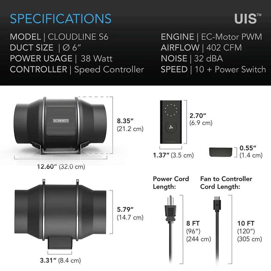 AC Infinity Cloudline pro S6 beépített ventilátor sebességszabályozással 100mm átmérővel jó választás hidroponikus termesztőhelyiségek csendes szellőztetésére, a helyiségek fűtésének vagy hűtésének fokozására, friss levegő keringtetésére és AV-szekrények hűtésére.