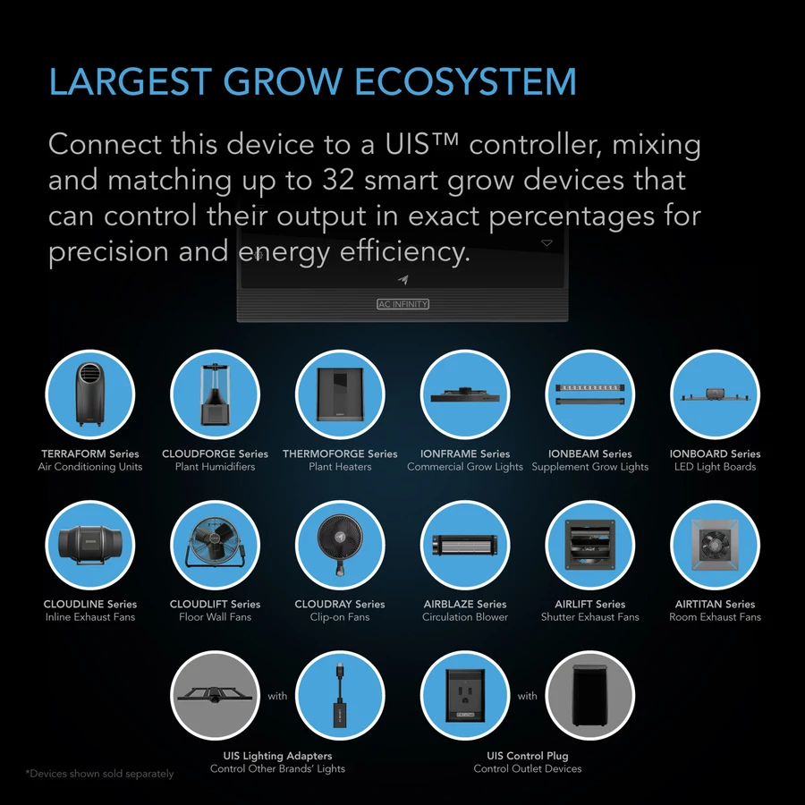 A termék az UIS™ termesztőeszközök és intelligens vezérlők platformjának része, amelyet úgy terveztek, hogy WiFi-n keresztül csatlakozzon az AC Infinity alkalmazáshoz az ideális környezet megteremtése érdekében.