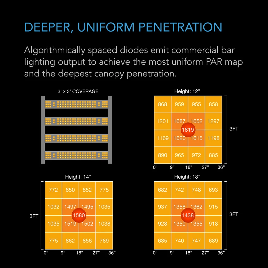 AC Infinity Ionframe EVO4 Samsung Growing LED-ek 300W teljesítménnyel a legkorszerűbb fejlesztésekkel rendelkező világítástechnikai eszközök. 3,14 µmol/J PPE névleges értékkel, ami az LM301B, LM301H és Bridgelux 3030 chipek közül a legmagasabb hatásfokú.