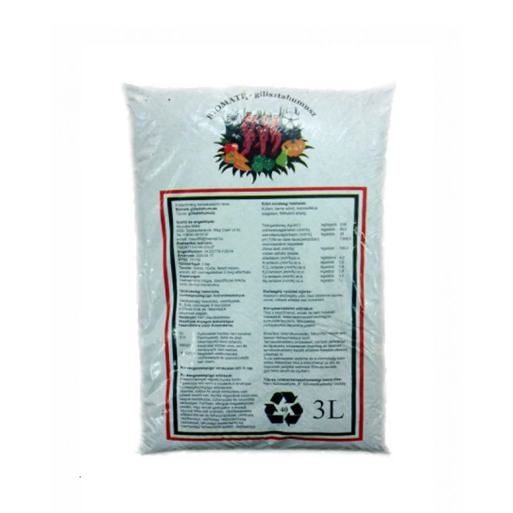 A Biomate Gilisztakomposzt (3 liter / 20 liter) egy 100%-ban szerves és ökológiai, nem toxikus anyag, használatával egészséges növények állíthatók elő. A gilisztakomposztban lévő mikroorganizmusok, enzimek, növényi tápelemek szervesen gazdagítják a talajt, közben szabályozzák PH egyensúlyát, biológiai és fizikai tulajdonságait. Növeli a szerves anyagok mennyiségét a talajban, használatának köszönhetően a növények erősebben, gyorsabban növekednek és érnek, továbbá a termésmennyiség 30%-kal is több lehet.