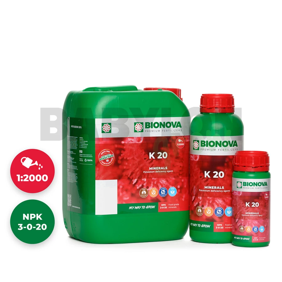 A BioNova K 20 élelmiszer-minőségű ásványi műtrágya, mely kulcsfontosságú minden termesztésben. A növényeknek nagy a káliumigényük az érési szakaszban. A kálium fontos szerepet játszik az ozmózis szabályozásában, a sztómák nyitásában és zárásában, a fehérjeszintézisben és az enzimek működésében. Ez jobb minőségű gyümölcsöt / virágot, jobb szilárdságot és szárazanyag-tartalmat eredményez. A kálium szilárdabbá teszi a sejteket (vízháztartás), és elősegíti a virágzást. Káliumhiány akkor nyilvánul meg, ha a növény nem nyitja ki eléggé a sztómát a párologtatáshoz, hogy lehűljön, ez a növény elhalásához vezethet. Káliumfelesleg esetén a növény fejlődése megáll. Minden talajkeverékhez alkalmazható és beltéri és szabadtéri művelésre egyaránt megfelelő.
