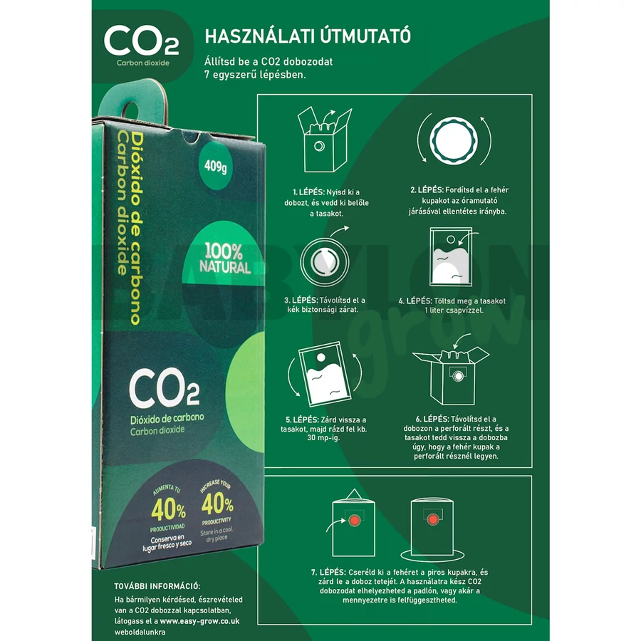 A CO2 termelő doboz segít meggyorsítani a növények növekedési sebességét. Így gyorsabban érik a termés, javul az íz, a szín és a hozam. A tasak használata biztonságos és egyszerűen beüzemelhető. A szén-dioxid annyira fontos a növények számára, mint az emberek számára az oxigén, tehát a növekedéshez az egyik legfontosabb elem. Amennyiben egy növény nem jut elegendő szén-dioxidhoz a levegőből, lassul a növekedést.