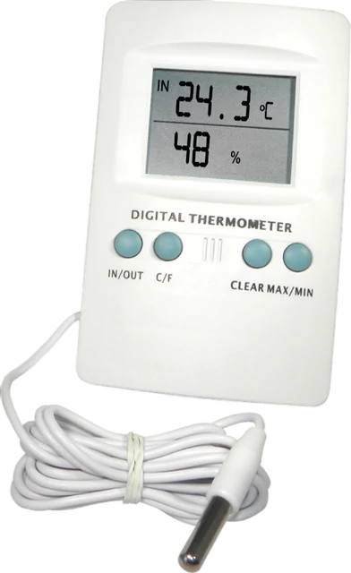 Digitális hőmérséklet- és páratartalommérő kábellel az aktuális klímakörülmények követéséhez.