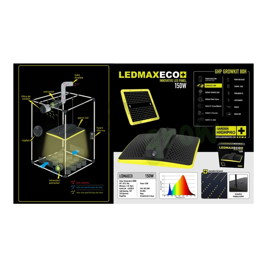 A Garden Highpro LEDMAXECO Full Spectrum LED 150W egy nagy teljesítményű, energiatakarékos és hosszú élettartamú növénynevelő lámpa, amely ideális 80 x 80 cm-es termesztési terület megvilágítására. Teljes spektrumú fényt biztosít, így a növények minden fejlődési szakaszához tökéletes megoldás. A 120°-os sugárzási szög egyenletes fényeloszlást garantál, míg a Plug & Play rendszernek köszönhetően a telepítés gyors és egyszerű. A lámpa beépített függesztőkonzollal érkezik a könnyebb rögzítés érdekében.