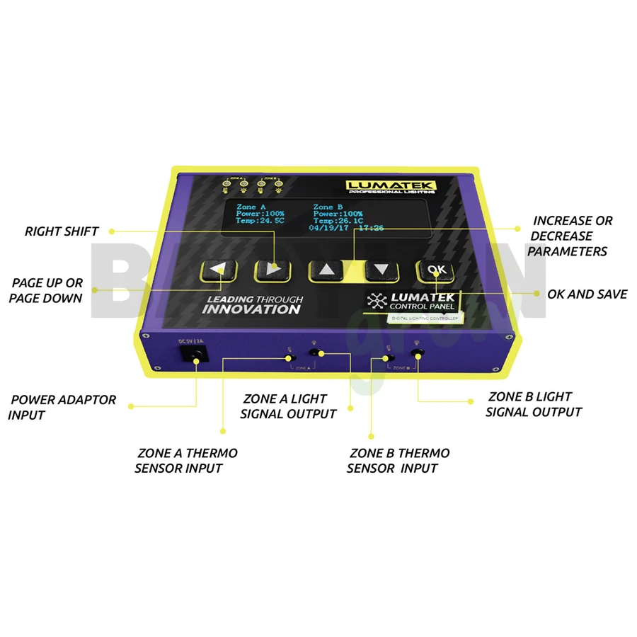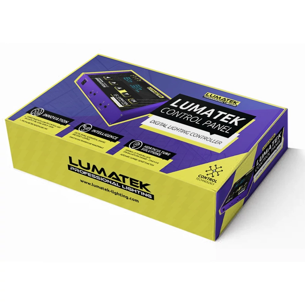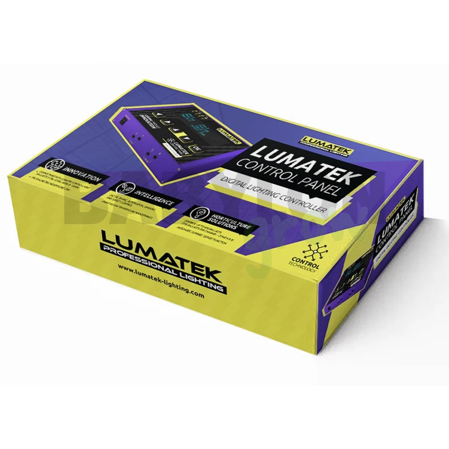 A Lumatek Control Panel világításvezérlő (HPS és MH izzókhoz) egy digitális világításvezérlő, amely irányítja a világítási rendszert. Az innovatív technológiát használva figyeli a szobahőmérsékletet, a fény időzítését, az automatizálást és a biztonsági szabályozást. Egyszerűen csatlakoztatva a Lumatek vezérelhető trafóhoz kontroll alatt tartható minden világítással kapcsolatos eszköz a termesztő helyiségben.