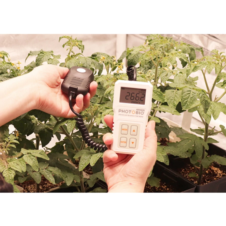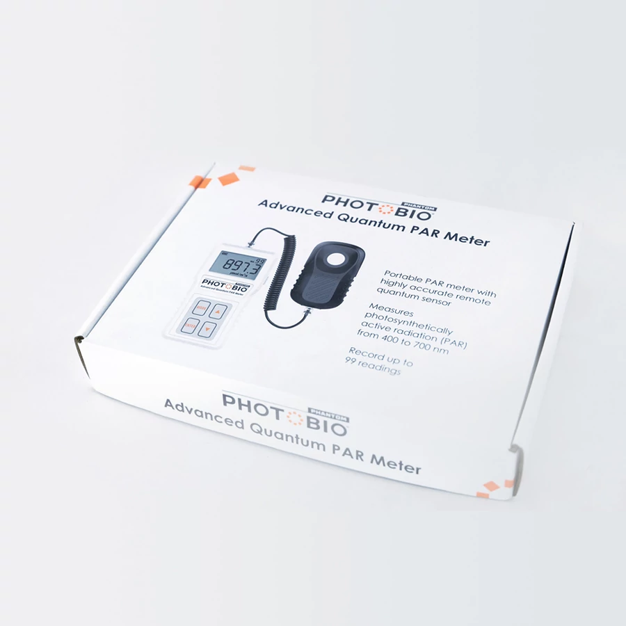 A Photobio Advanced Quantum PAR mérő egy kompakt, hordozható mérőműszer nagy pontosságú kvantumérzékelővel, két csatlakozókábellel (rövid tekercselésű és 3,6 méter), AAA elemekkel és védő hordtáskával. Akár 99 mérési értéket képes tárolni kényelme a könnyű visszakereshetőség érdekében, miközben a lámpatest magasságát, a fényerőszabályzó beállítását és egyéb környezeti változásokat képes követni a növekedés minden fázisában. Kompatibilis a modern, egyforrású és kiegészítő LED-es lámpatestekkel, nagynyomású nátrium (HPS) DE termesztőlámpákkal, valamint bármilyen hagyományos beltéri termesztőfényforrással.