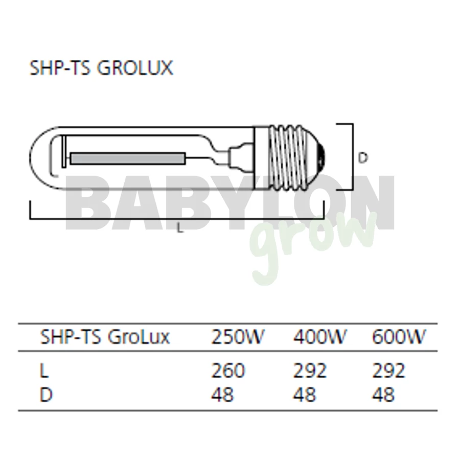A Sylvania Grolux HPS izzó egy nagynyomású, sárgás fényű nátriumgőz lámpa, mely elősegíti a növények fotoszintézisét. Színhőmérséklete 2050 K, ami azt jelenti, hogy nagyrészt a vörös színspektrumban sugároz. Ez leginkább a növények virágzási szakaszában való használatra teszi alkalmassá. A szabadalmaztatott íves bura elősegíti a legmagasabb fotoszintetizáló hatékonyságot. A javított külső buraszerkezetnek köszönhetően a lámpa teljesítménye kivételesen jó. Nagyobb Phytolumen kibocsátásra lett optimalizálva. Fényspektruma maximalizálja a vörös fény kibocsátást, ami létfontosságú a növények növekedéséhez, valamint kivételes lumenmegtartó képességű, még az élettartama végefelé is 95%-os teljesítményt nyújt.