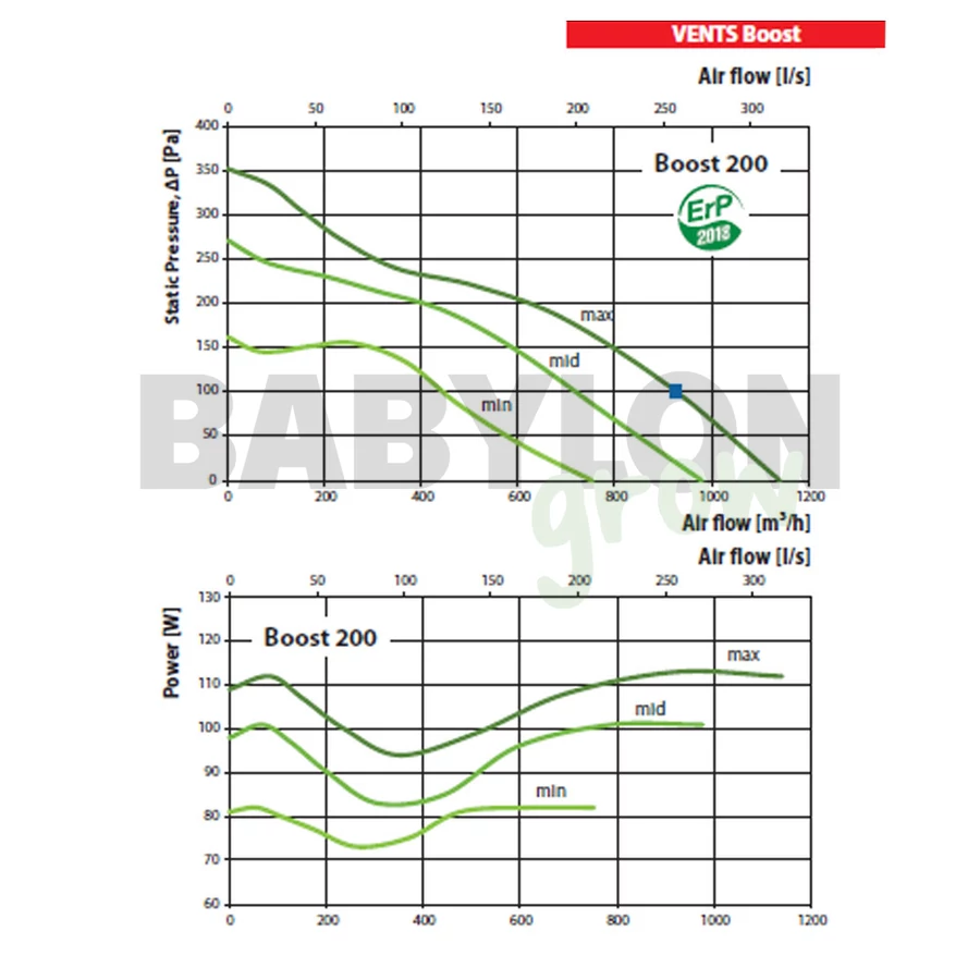 A Vents Boost ventilátor egy hang- és hőszigetelt vegyes áramlású csatornaventilátor nagy légteljesítménnyel. Egyfázisú, nagy hatásfokú, háromsebességes aszinkron motorok. A motor hőkapcsolókkal van felszerelve - a túlmelegedés elleni védelem érdekében. A golyóscsapágyak hosszú élettartamot biztosítanak. A háromfokozatú motor a beépített kapcsolóval vezérelhető.