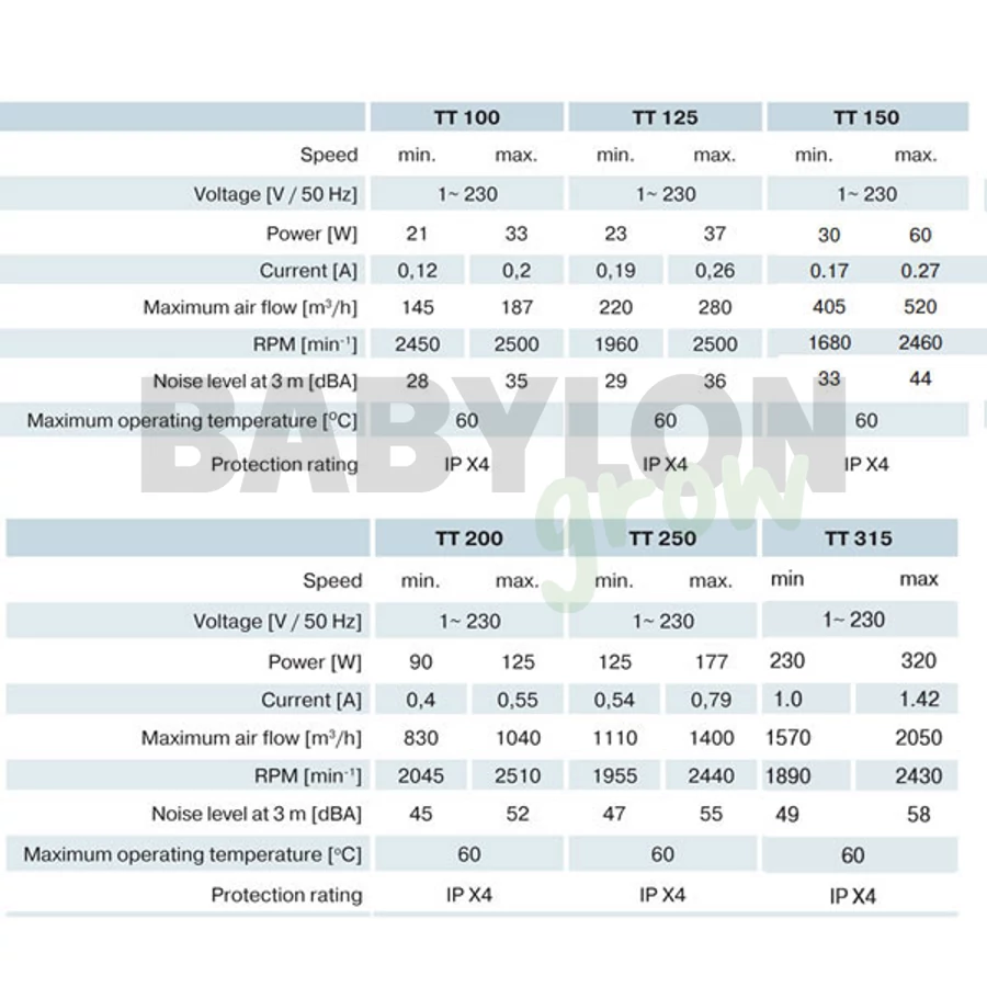 A Vents TT elszívó csőventilátorokat halk működés jellemzi. A Vents TT szériája kevert légáramú csatorna elszívó ventilátorokat tartalmaz, két sebességű motorral. A minumum sebességet az L1, a maximum sebességet az L2-es bekötéssel tudjuk működtetni. A képek között megtalálhatóak a két működtetéssel járó teljesítmény, légszállítás (m3/h) közti különbségek.